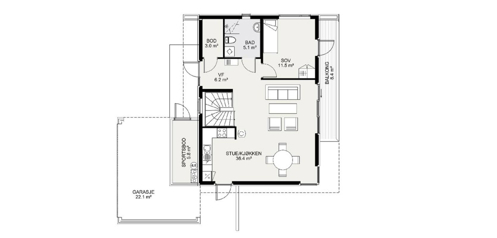 På grunn av den skrå tomten ligger adkomsten til huset på øvre plan, med en stor overbygget carport og sportsbod som skaper et flott inngangsparti og tilknytning til huset. Inne i huset finner du alle nødvendige hovedfunksjoner på ett plan, inkludert stue, kjøkken, bad og soverom. Det store fellesrommet, som kombinerer både kjøkken og stue, har et flott hjørnevindu og store vindusflater som gir mye lys og karakter. Du har også tilgang til en lang balkong fra stuen gjennom en skyvedør i glass som skaper en fin åpenhet på varme dager.
