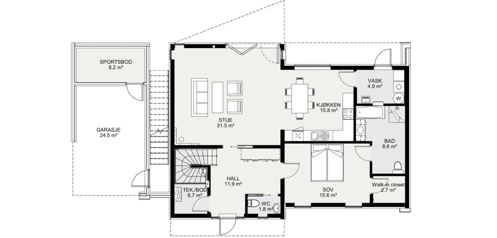Hovedinngangen er på grunnplanet og er overbygd for ekstra komfort. Takhøyden på hele 2,7 meter i inngangsparti og stue skaper en fantastisk romfølelse når du kommer inn. En romslig hall ønsker deg velkommen og gir tilgang til praktisk gjestetoalett og en teknisk bod. Herfra kan du bevege deg til avslapningssonen med hovedsoverommet, som har eget walk-in-closet og en egen luksuriøs baderomsløsning. Du kan også gå rett inn i den romslige stuen med åpen løsning mot kjøkkensonen. De store vindusflatene gir deg rikelig med naturlig lys og en lys og luftig atmosfære. I tilknytning til kjøkkenet finner du vaskerommet med egen utgang til hagen. Kjøkken- og soveromsavdelingen, samt vaskerommet, har en takhøyde på 2,5 meter.