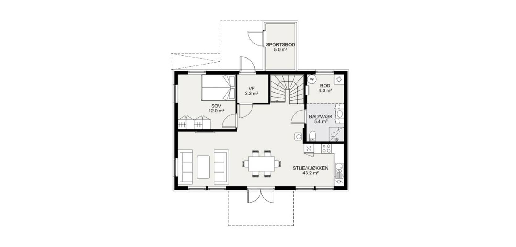 Oppholdsrommet er lyst og åpent, og delt inn i soner som gjør det praktisk for både avslapning og bespisning. Du vil elske å tilbringe tid i dette rommet, med massevis av naturlig lys som strømmer inn gjennom de store vinduene. Terrassen utenfor er også en sjarmerende plass hvor du kan nyte sommerkvelder med familie og venner.